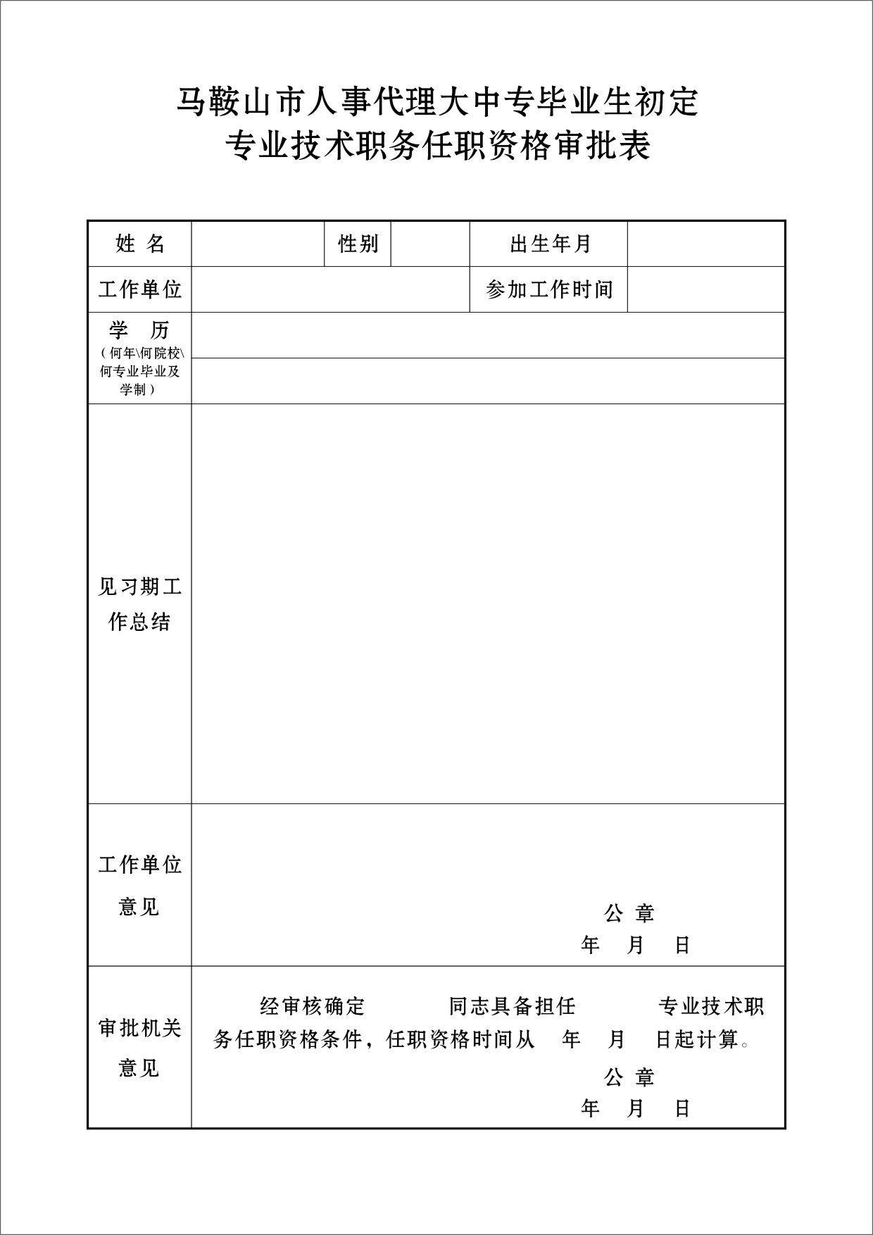 附件2:馬鞍山市人事代理大中專畢業(yè)生初定專業(yè)技術(shù)職務任職資格審批表