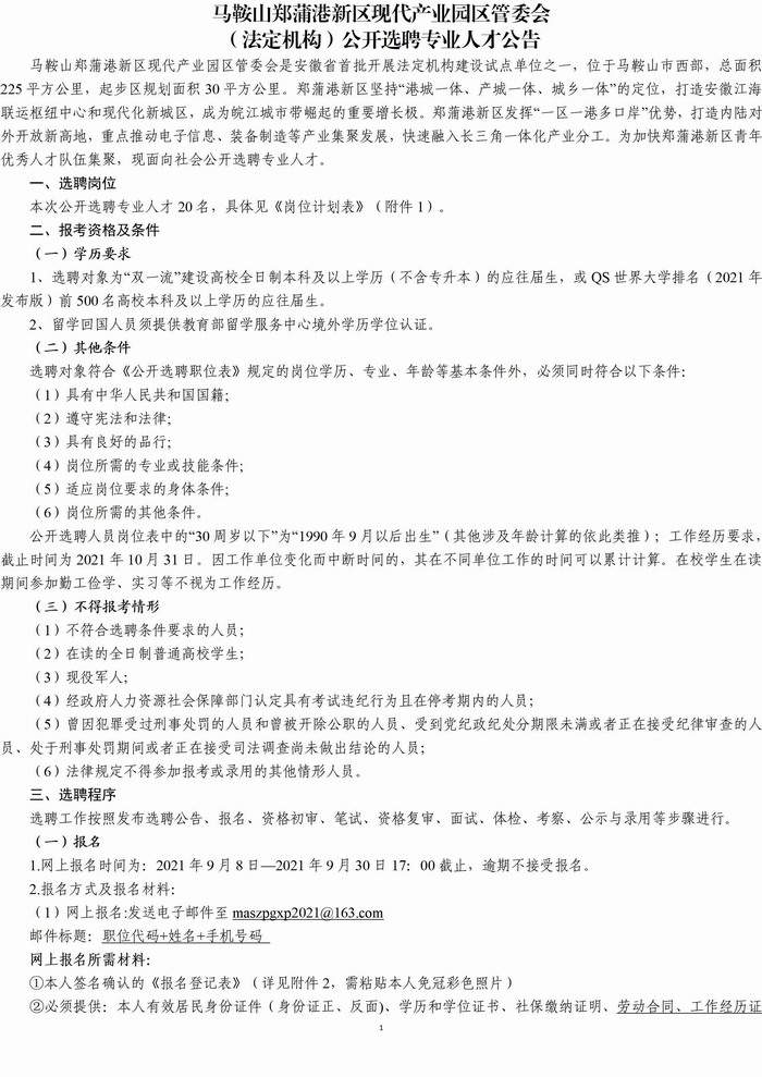 附件8:馬鞍山鄭蒲港新區(qū)現(xiàn)代產(chǎn)業(yè)園區(qū)管委會(huì)(法定機(jī)構(gòu))公開選聘專業(yè)人才公告